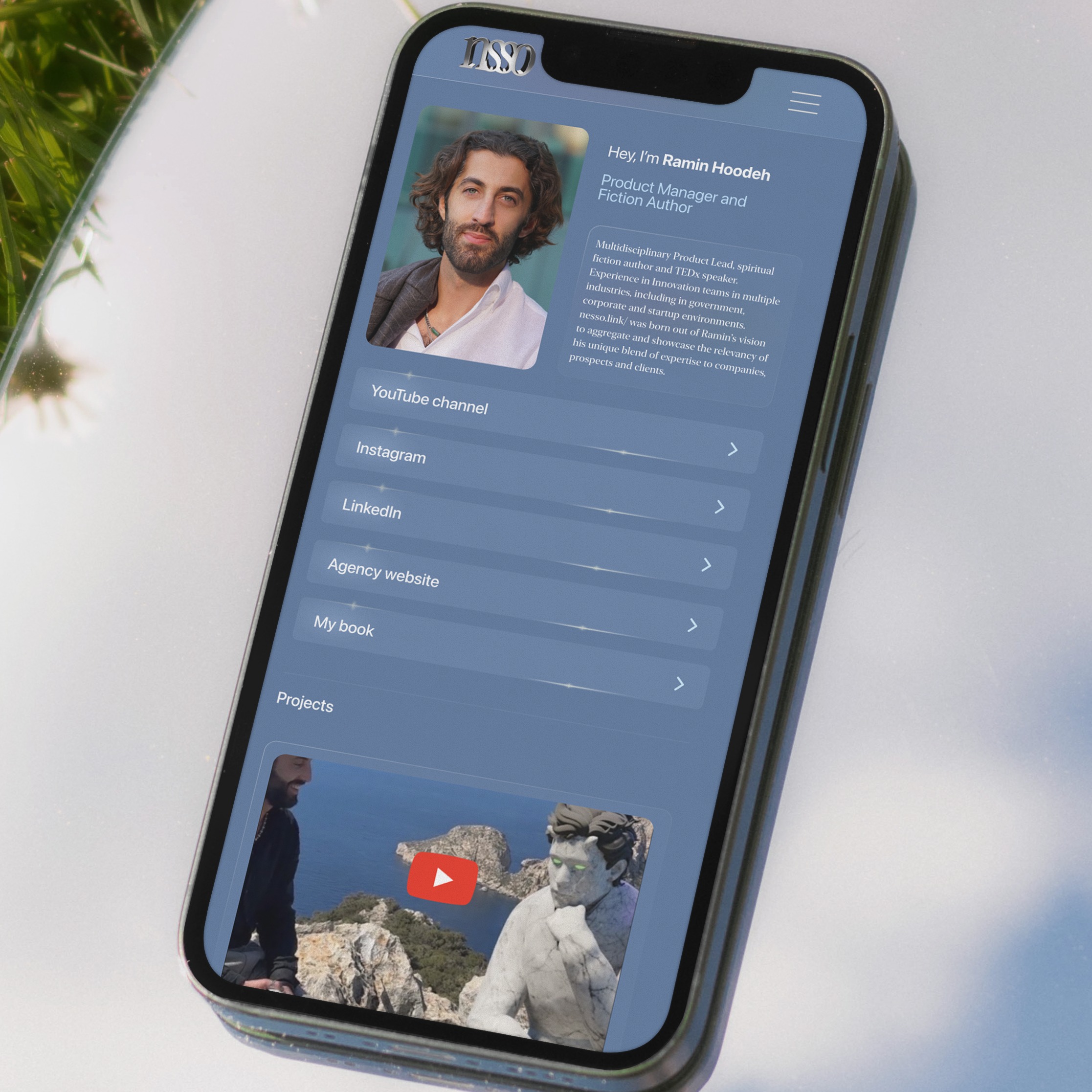 nsso stands for new sovereign self online. At nsso, we want to see you recognise your uniqueness, value, and inherent beauty, so you can unlock the opportunities you deserve. That’s why our mission is to evolve your identity alongside the world, by providing you with the most beautiful way to present yourself online. We call this: future-proofing yourself. We future-proof you through a carefully designed profile that seamlessly integrates both your personal and professional identity in one place. So, have a look. See how my nsso site brings together all my social media and digital links, making it easy for people to find me and my diverse work online. In my projects section, you can see how my personal and professional experiences compliment each other. This is why I use my nsso profile as a next-gen digital résumé. Just under that, I have a space to list and sell my products and services, allowing others to see the expertise and experience behind my offerings. And while my nsso profile makes it easier to do business with me, this isn't my sole focus. What excites me is that I finally have a way to present myself in a way that not only makes me feel clear, but proud, of who I am. In a world of ever-increasing noise and opportunity, I value this clarity more than anything. And now, I want to give that to you. Future-proof yourself using my sign up link, and start seeing yourself in a whole new light.